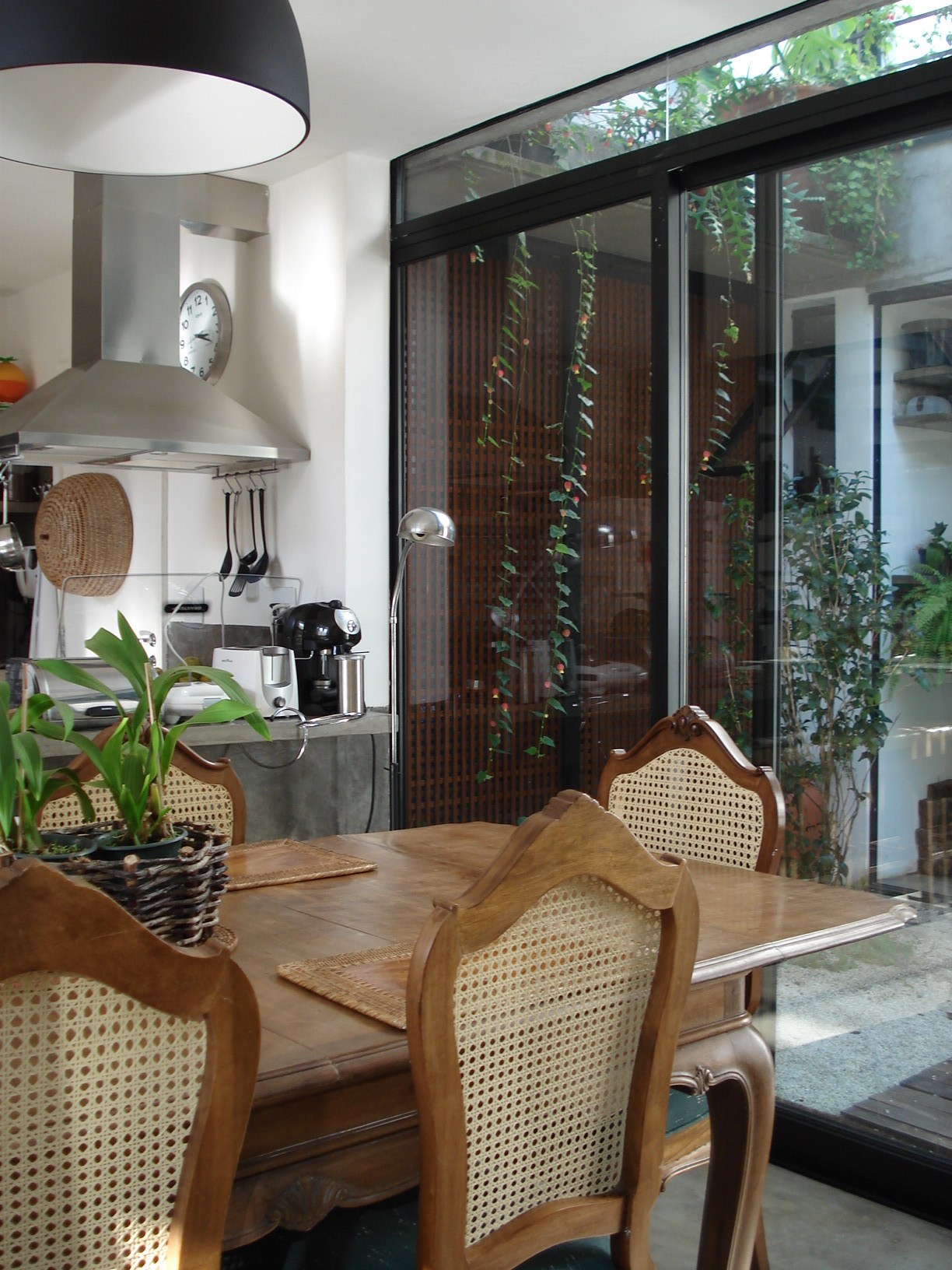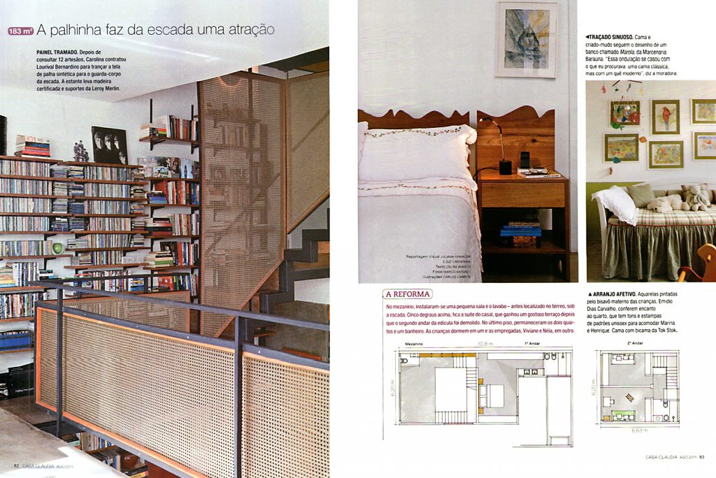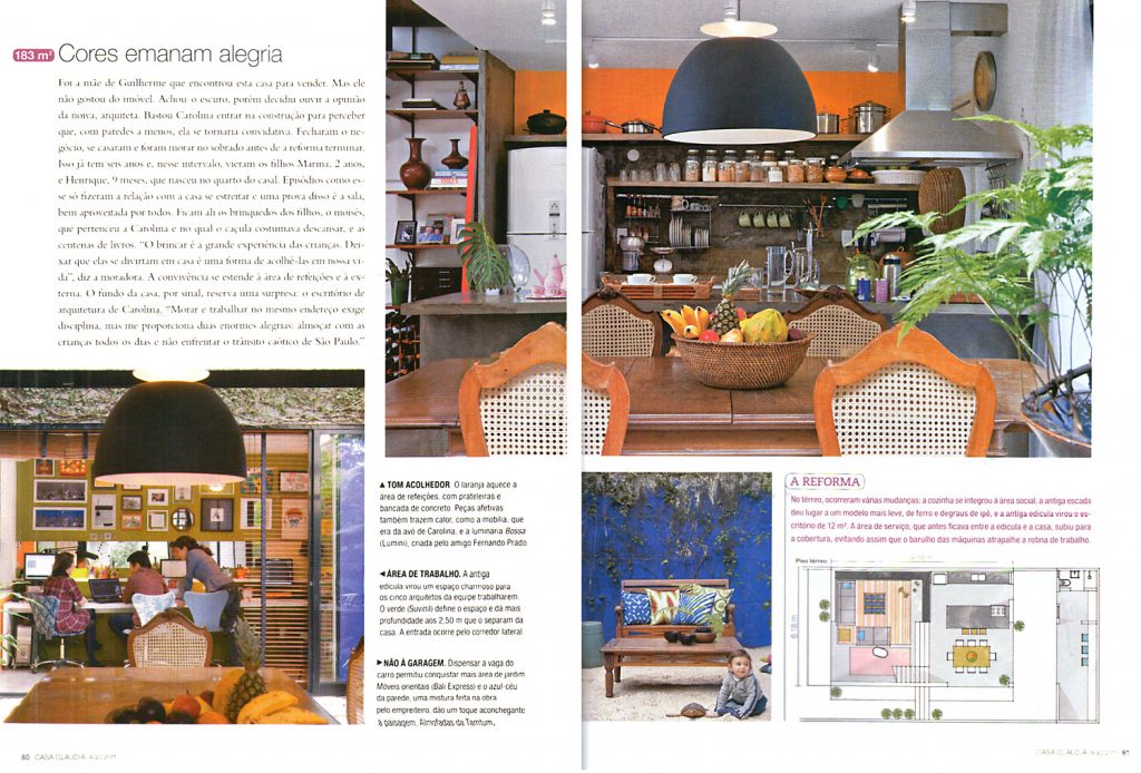 Abertura dos espaços internos, aumento das entradas de luz, circulação vertical leve e periférica liberando espaço. Demolição da edícula com dois andares, ligação do volume principal à edícula abriga banho casal no superior e lavanderia no inferior.