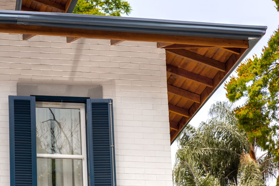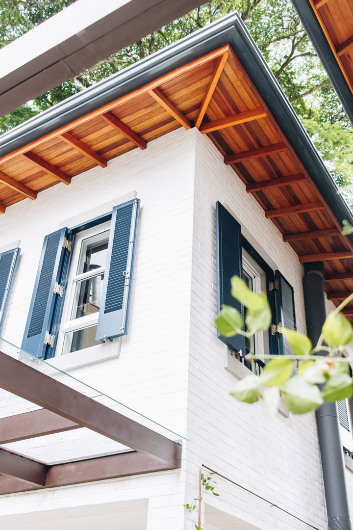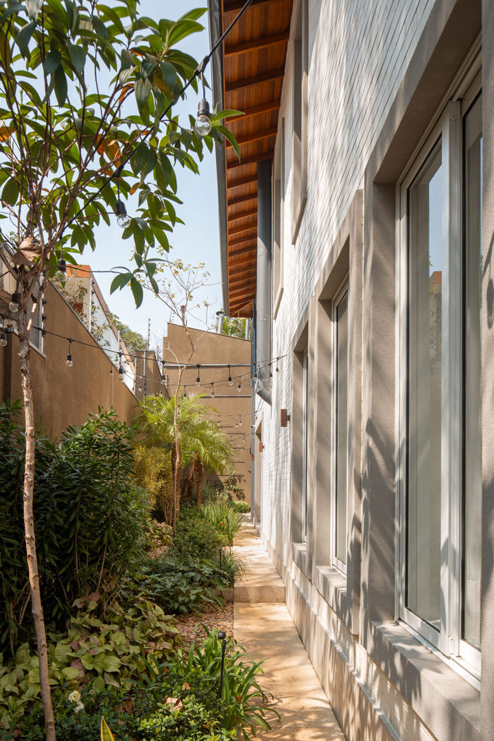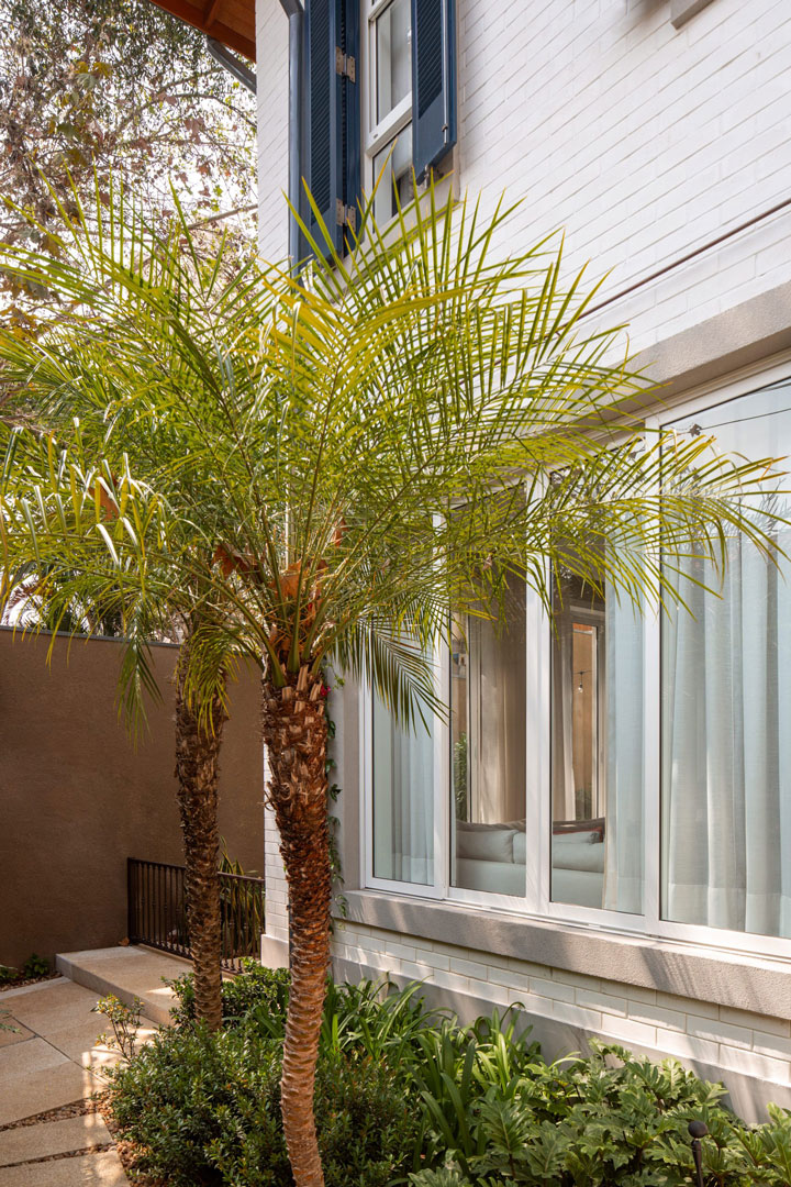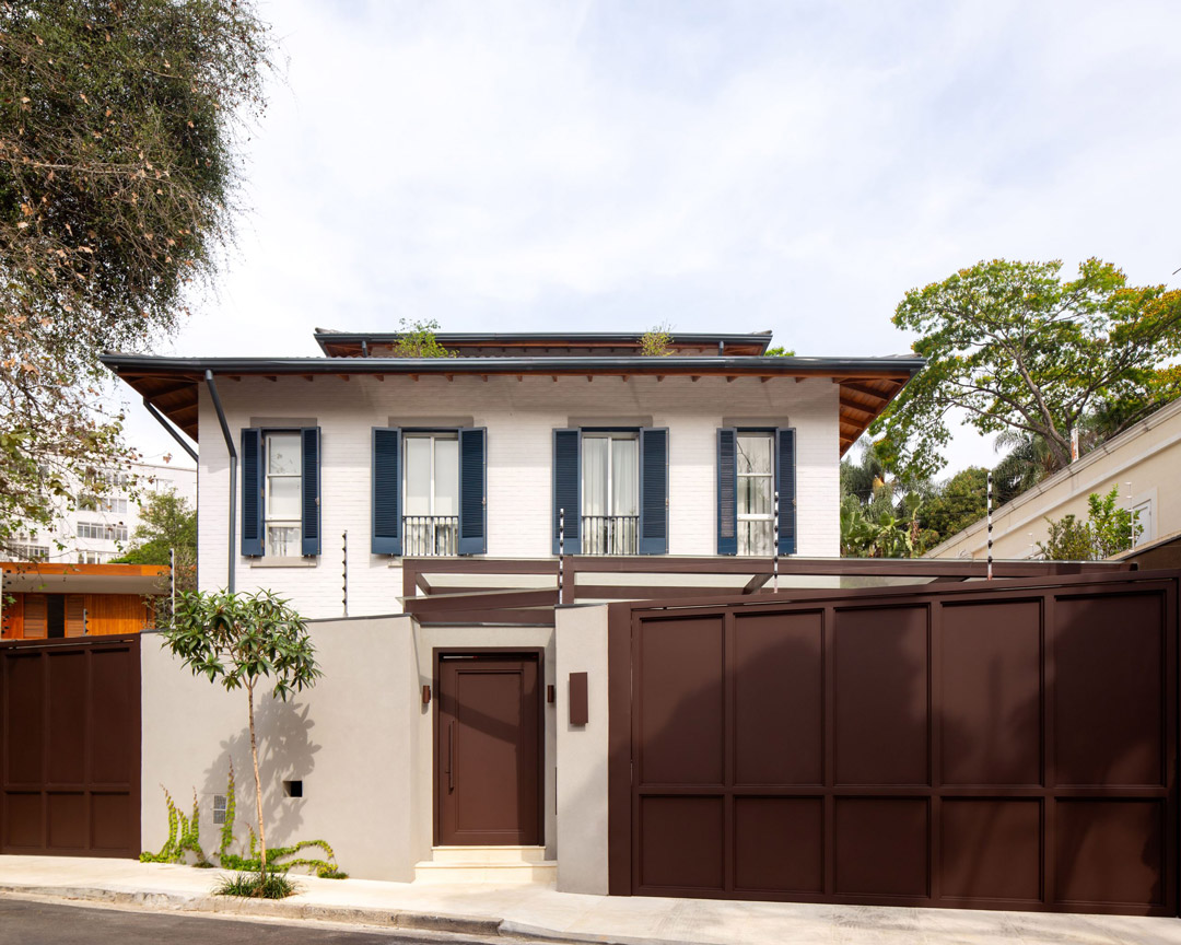 • Arquitetura: Possui uma forma mais clássica e acolhedora, com venezianas azuis, tijolinho branco, uma porta vermelha na entrada e um telhado inclinado com telhas, elementos que refletem a identidade desejada pelos proprietários e se harmonizam com o bairro.