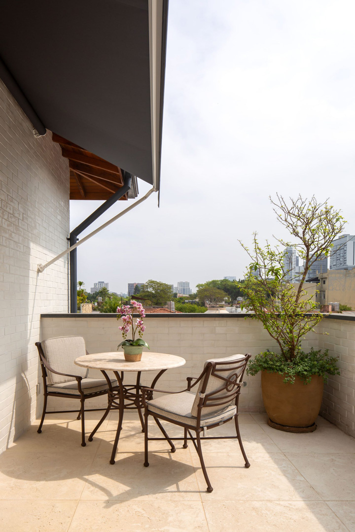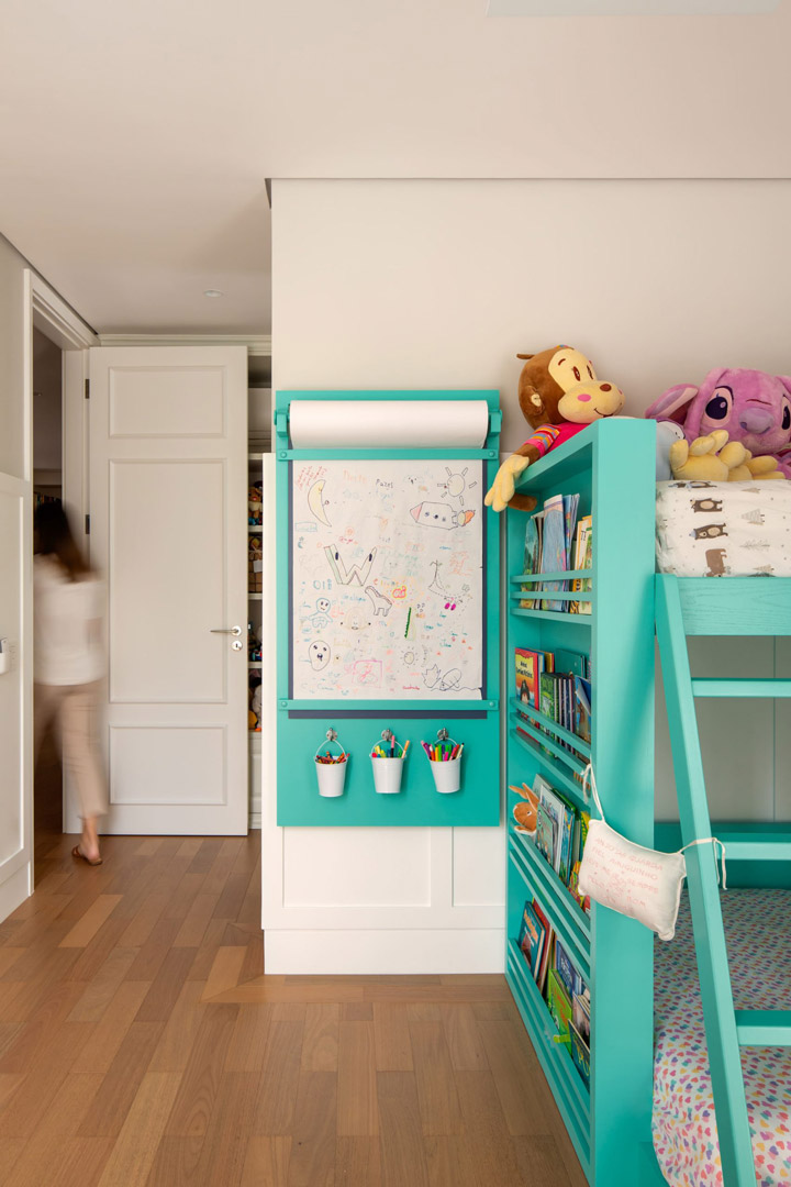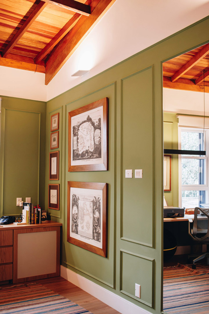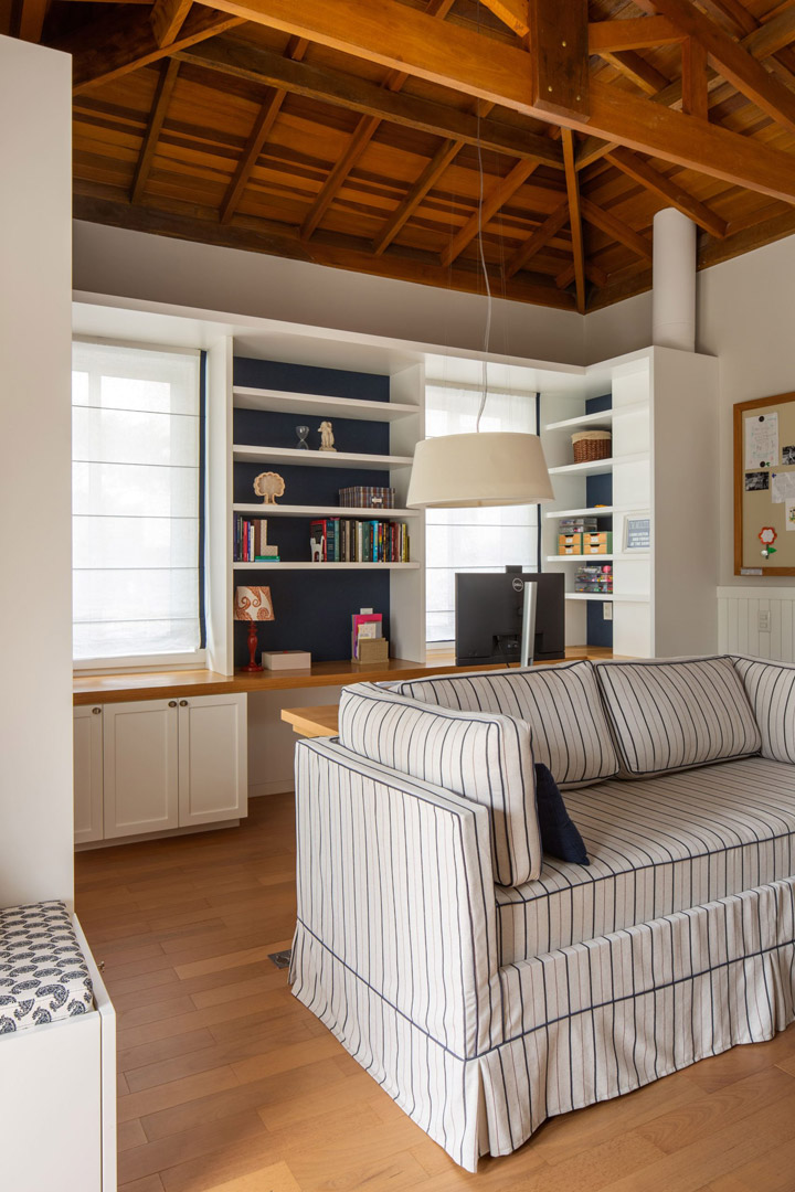 • Ático: Funciona como escritório da proprietária e quarto de hóspedes, acomodando a avó das crianças quando ela vem se hospedar.
